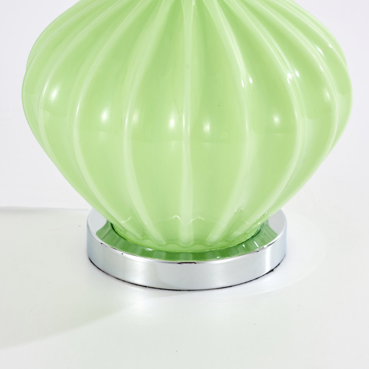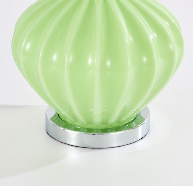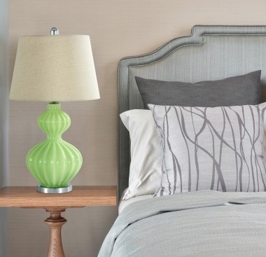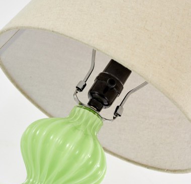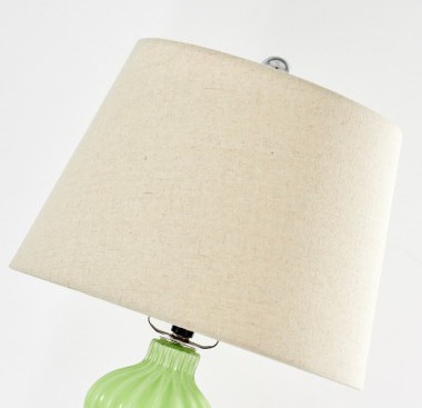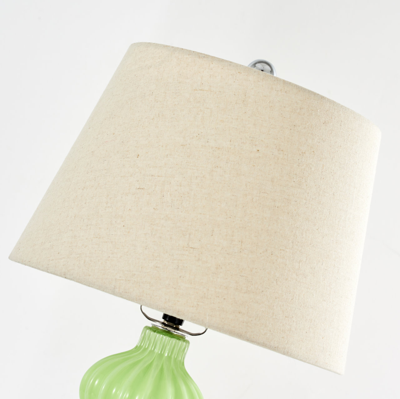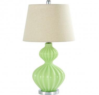 If you've been looking to add color and texture to a tabletop, this contemporary table lamp is the solution. It delivers a curvy glass body with delicate ribs and a vibrant light green coloration. An hourglass silhouette is augmented with a beige fabric shade in a modern cone shape that casts soft illumination in a bedroom or living area. Add one standard 60-watt bulb (not included) and enjoy this beautiful table lamp.