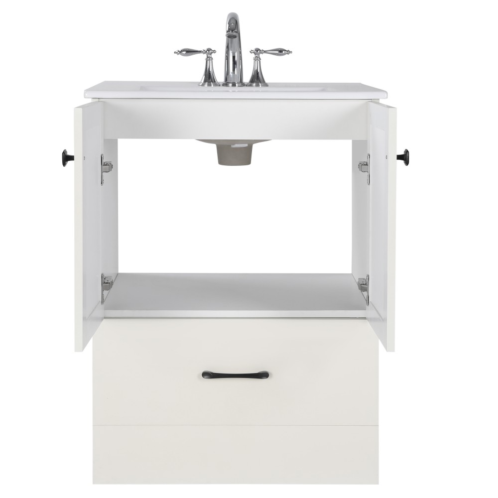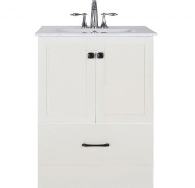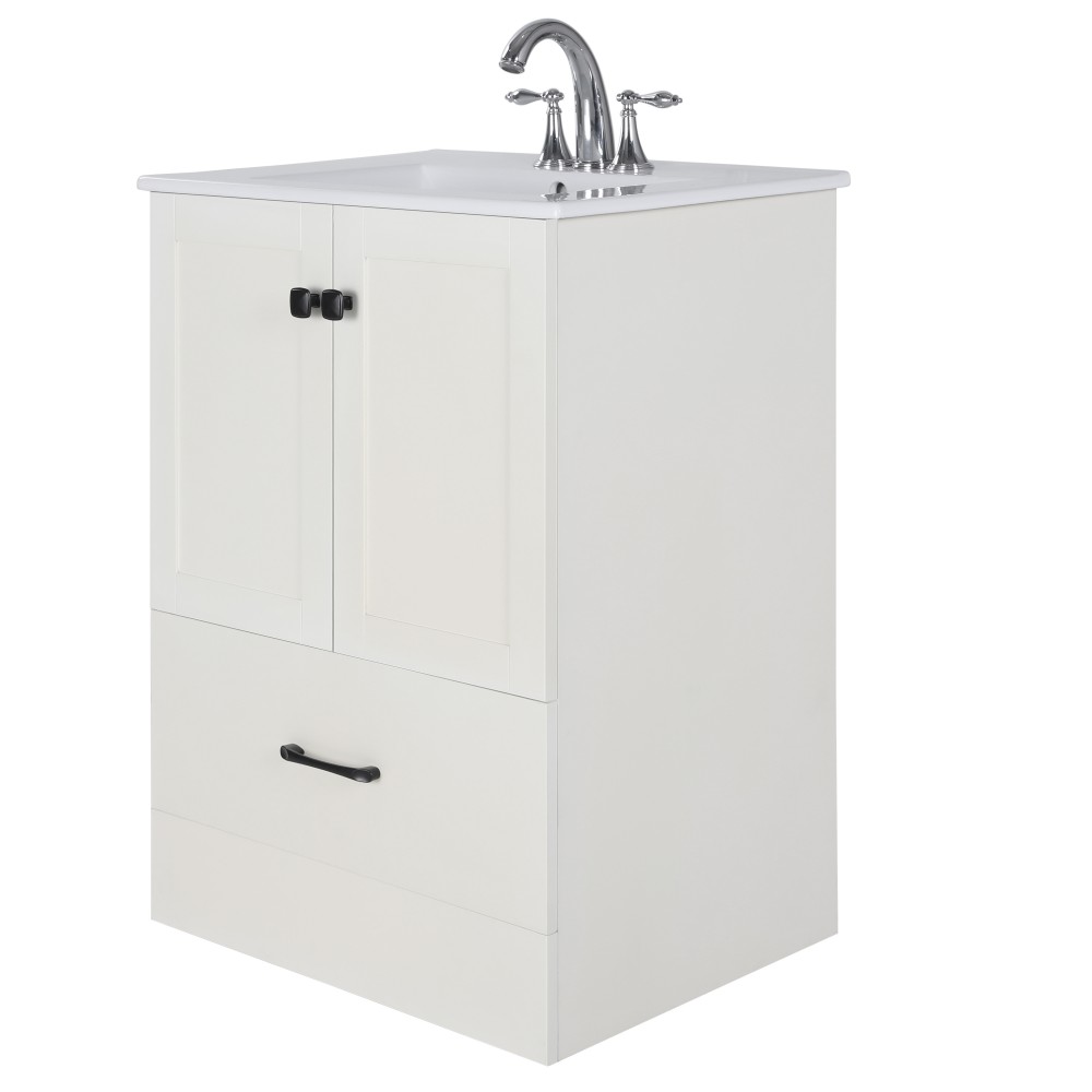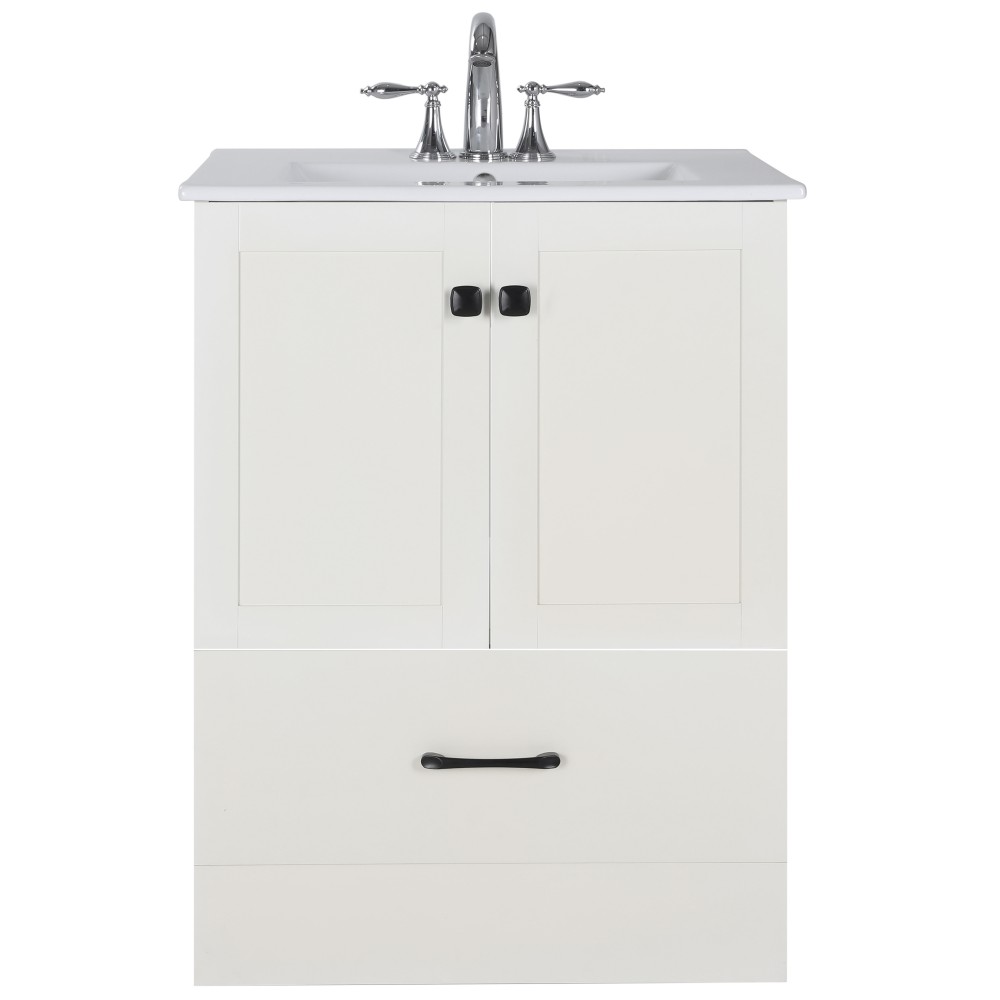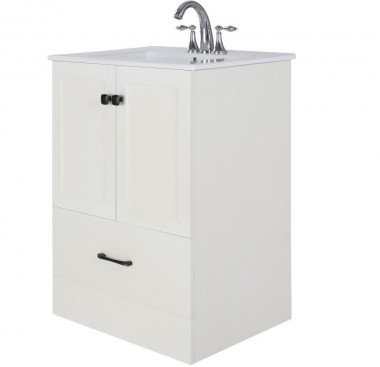 Paneled doors and contrasting hardware add charm and character to this lovely contemporary single sink vanity cabinet. The vanity is perfect for updating a powder room or compact bathroom. It delivers ample storage in a two-door lower cabinet and one drawer, which combine to keep essentials and other items tucked out of sight. The square sink and countertop are done is a matching white finish to complete a clean, modern aesthetic.