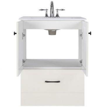 - Modern vanity features and white sink top over abundant storage in one drawer and a two-door cabinet.