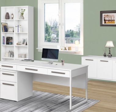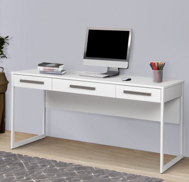 Set this Alaska writing desk in a multi-functional guestroom or home office to create a clean, studious work environment. With a minimal, sleek look, the spacious desktop surface features a white melamine laminate over MDF construction and is supported by sturdy steel legs. Turn the convertible middle drawer of this computer table into a keyboard tray between two flanking drawers that hold office supplies and stationery. Place this chic study table into a contemporary loft or modern style home.