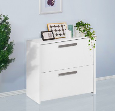 Keep organized in a home or business office space with this two-drawer lateral file cabinet from the Alaska collection. A contemporary design perfect for modern living, the cabinet features two drawers with hanging file bars. Storing and accessing paperwork is suddenly simple and easy. The cabinet offers a versatile white woodgrain finish over laminate surfaces and each drawer is complete with a nickel finish bar pull to complement its sleek look and feel