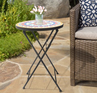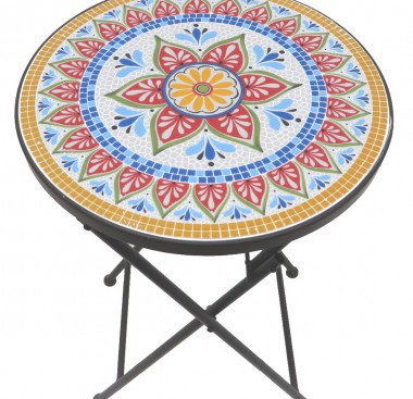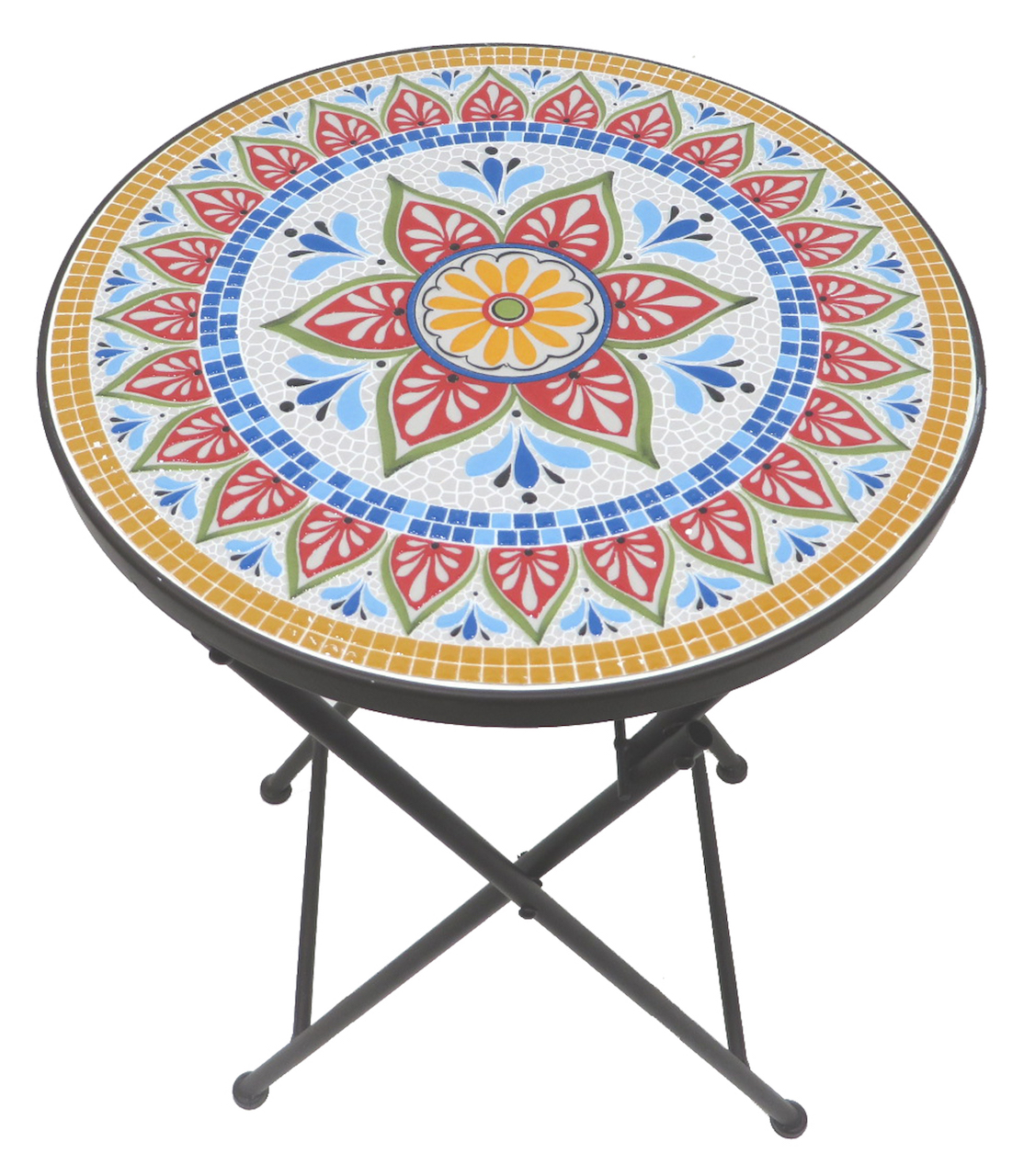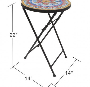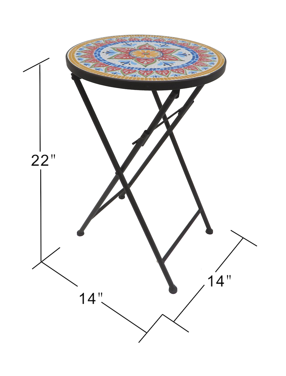Color, texture, detail, and a compact silhouette, the Lori Mosaic side table has it all. This decorative accent table is perfect for a cup of coffee in the morning sun or a refreshing glass of lemonade on a hot August afternoon. The table features a vibrant multi-colored red, blue, and white tile mosaic design with a bold floral medallion pattern brimming with intricate detail. Because it folds, this transitional table is easy to tuck out of the way when not in use.